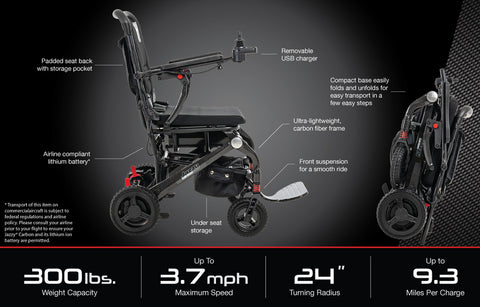 Weighing in at a stunning 43.6 pounds, Jazzy Carbon still provides top speeds up to 3.7 mph with a weight capacity of 300 pounds.